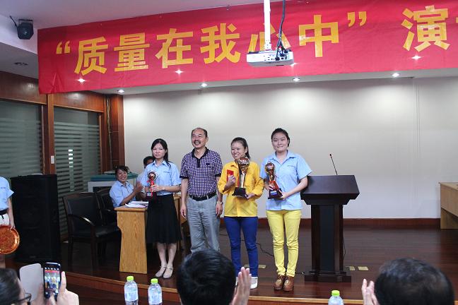 十位選手聲情并茂的精彩演講后,經(jīng)過(guò)裁判的認(rèn)真評(píng)分和工作人員的緊張計(jì)算,主持人現(xiàn)場(chǎng)揭曉了比賽結(jié)果,李華英、鄭瓊、李雅分獲比賽前三名。孫錦龍、吳益民、蔣忠燦等公司領(lǐng)導(dǎo)獲獎(jiǎng)選手頒獎(jiǎng)。